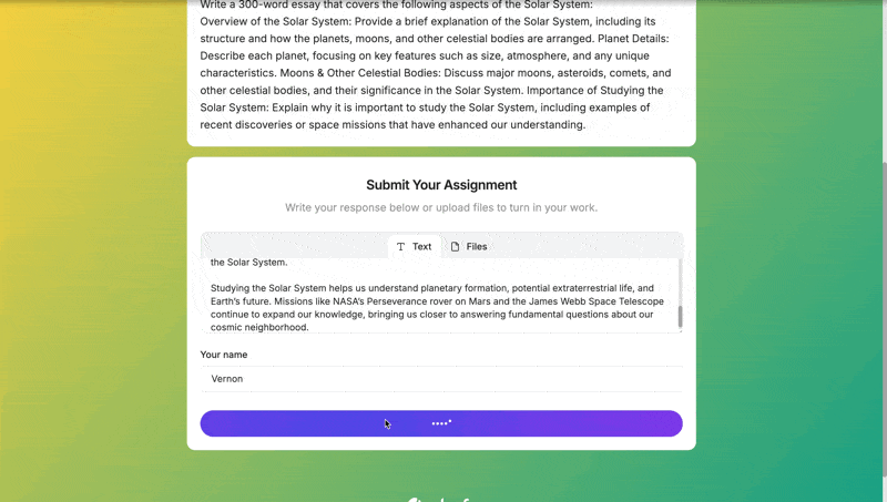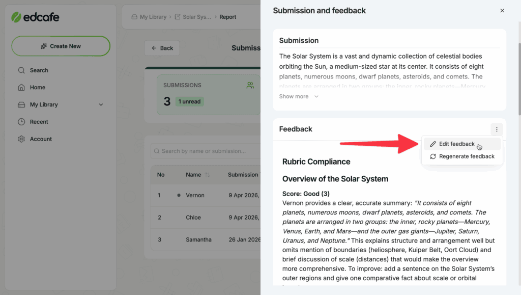 The AI generates student feedback for all submissions, and you can review and edit each one from the submissions dashboard.
