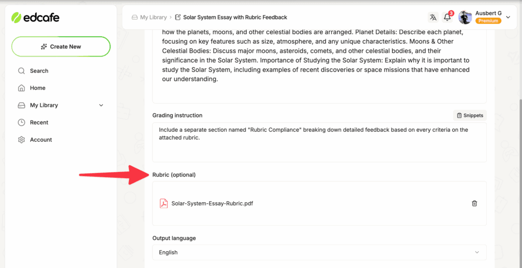 For example, Edcafe AI’s Assignment Grader includes a dedicated rubric upload field where you can drop in a PDF, or any standard document format.