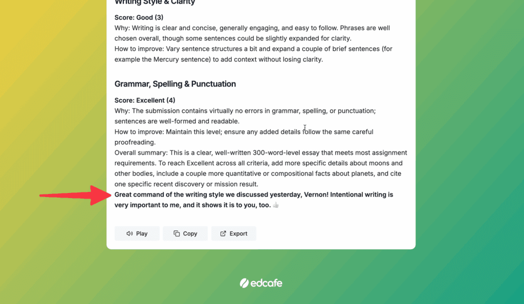 | Essays & open-ended work | After teacher review and editing | Comprehensive, structured feedback covering strengths, areas for improvement, and next steps |