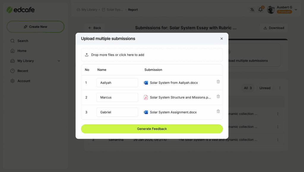 - Multiple files at once – Drop in a batch of student submissions (PDFs, Word docs, etc.)