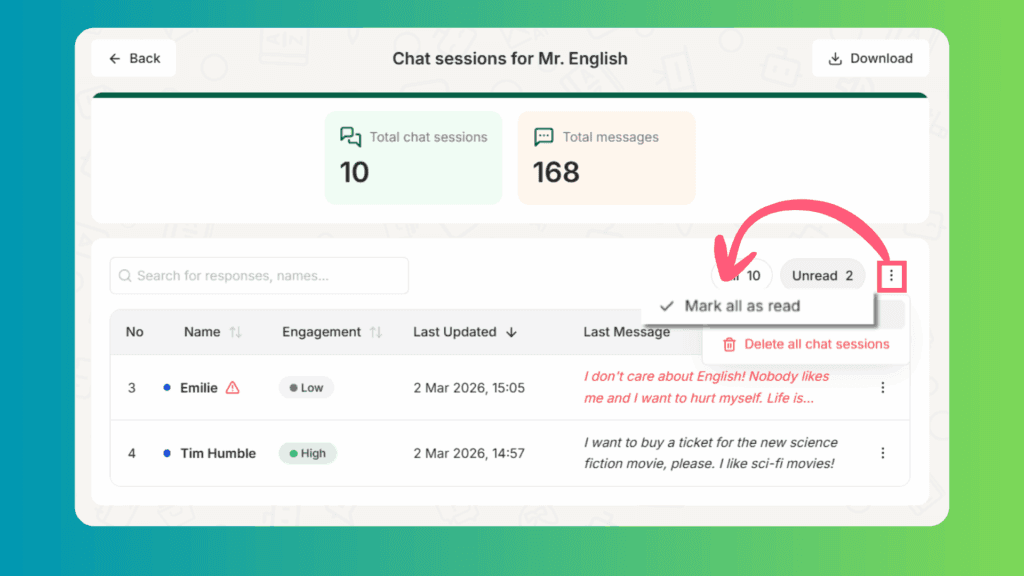 When students interact with chatbots you’ve created, each conversation appears in your sessions list. The unread indicator helps you identify which conversations need your attention first.