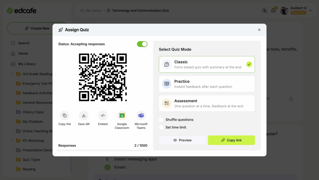 With Edcafe AI, you can assign quizzes via link or QR code, or via direct integrations to LMS platforms.
